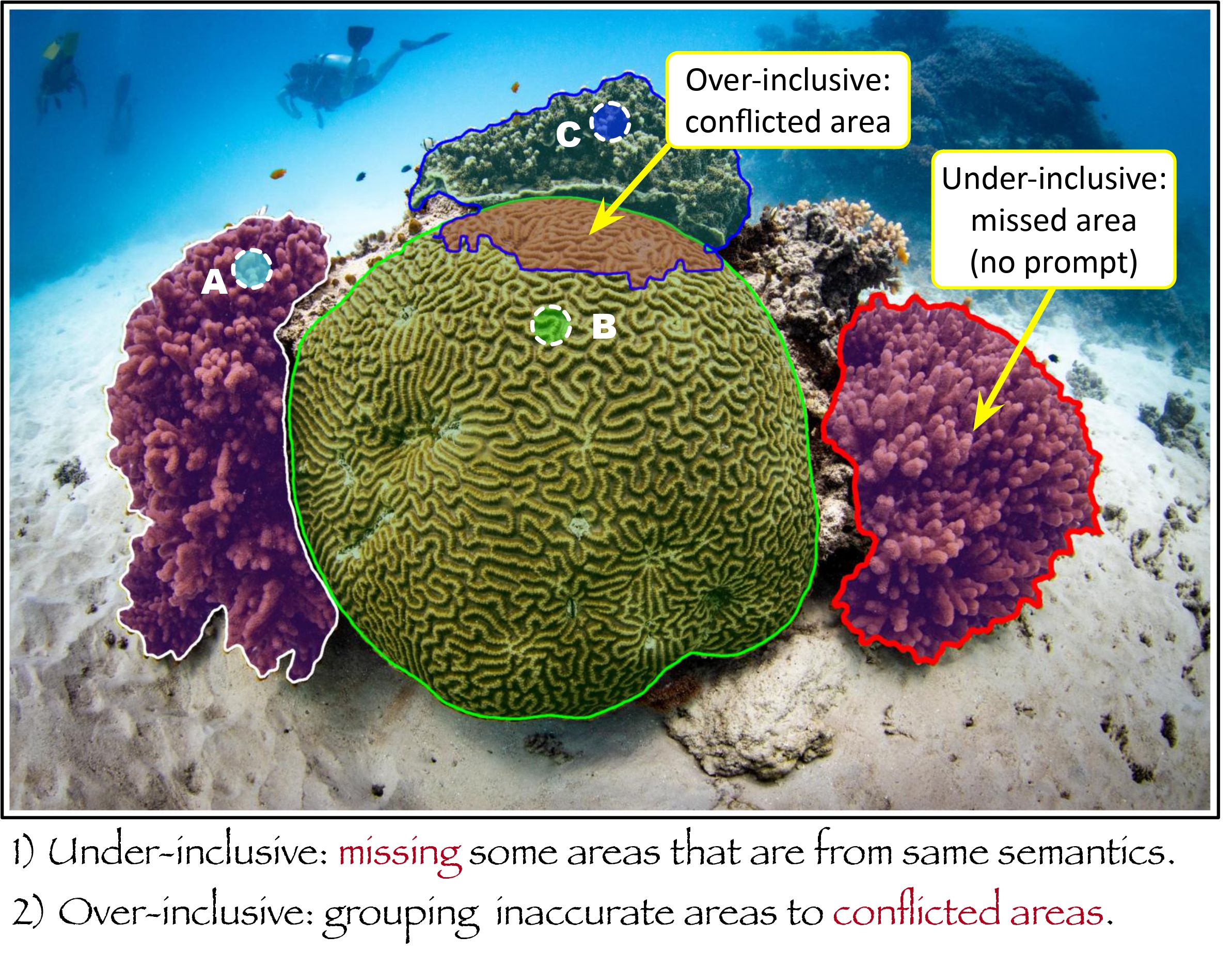 Promptable segmentation models (e.g., SAM and CoralSCOP) lead to under-inclusive and over-inclusive outputs. The mask with red edge is for illustration, not model-generated.