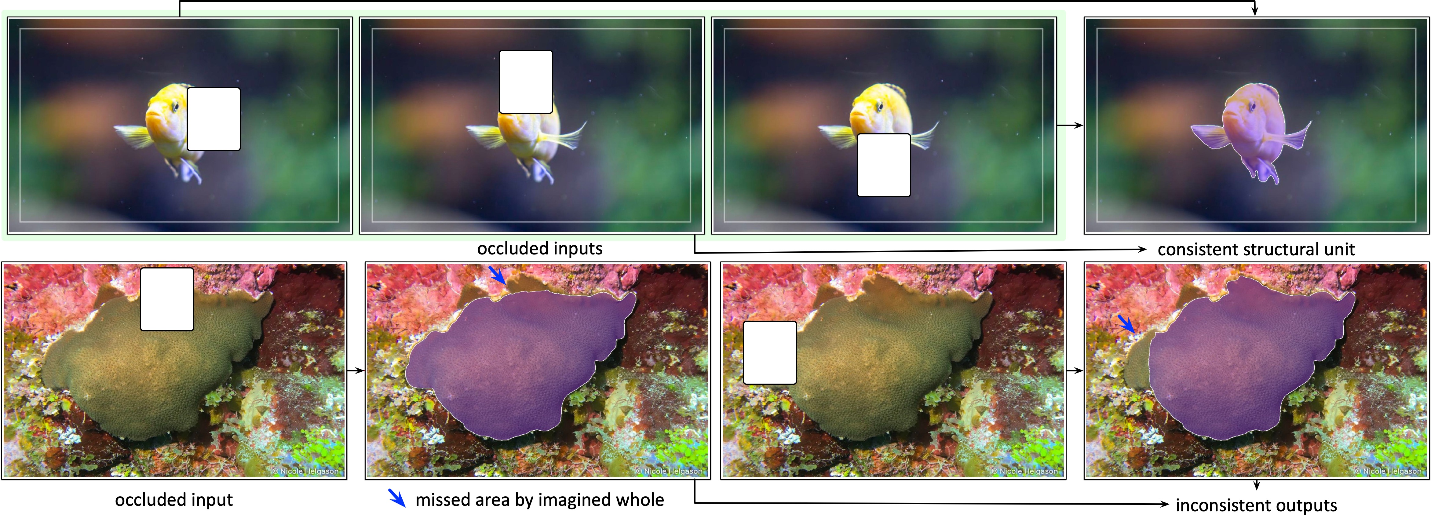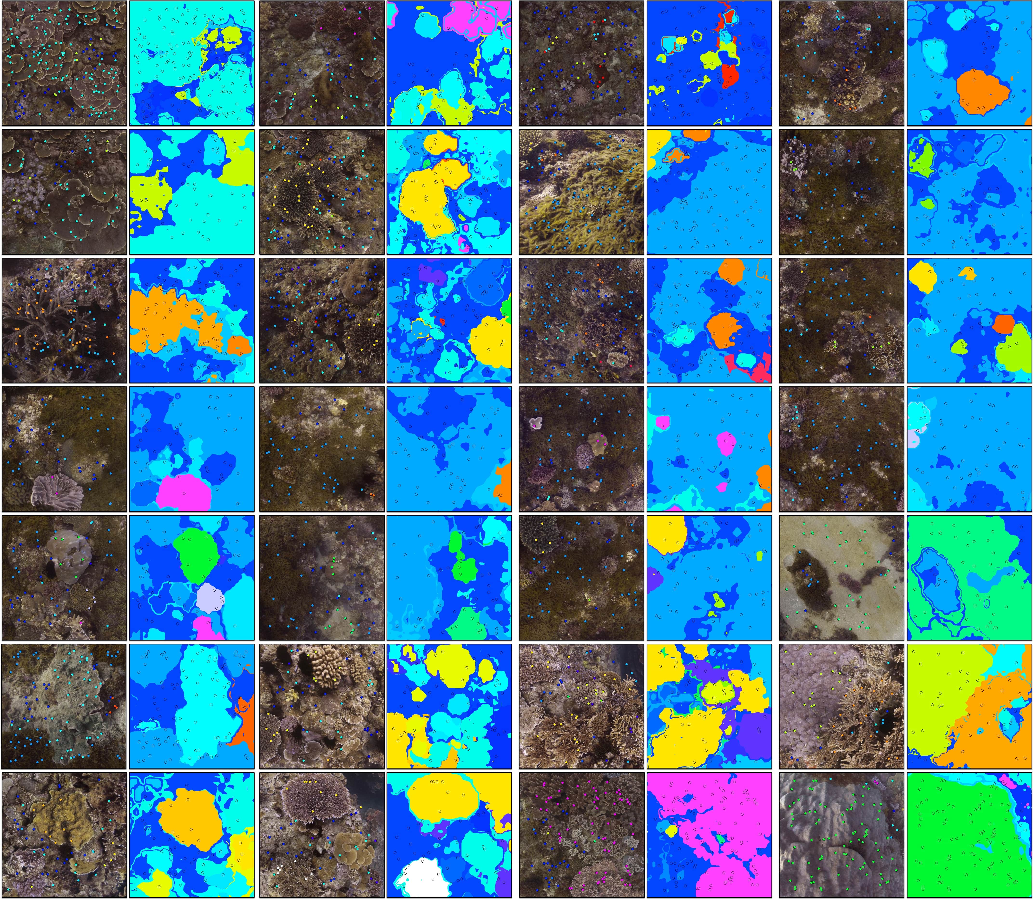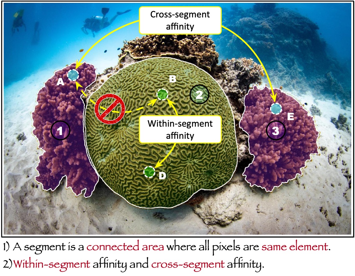 Our simple and fundamental problem formulation for coral reef semantic segmentation: segment as the basis to model within-segment and cross-segment affinities.